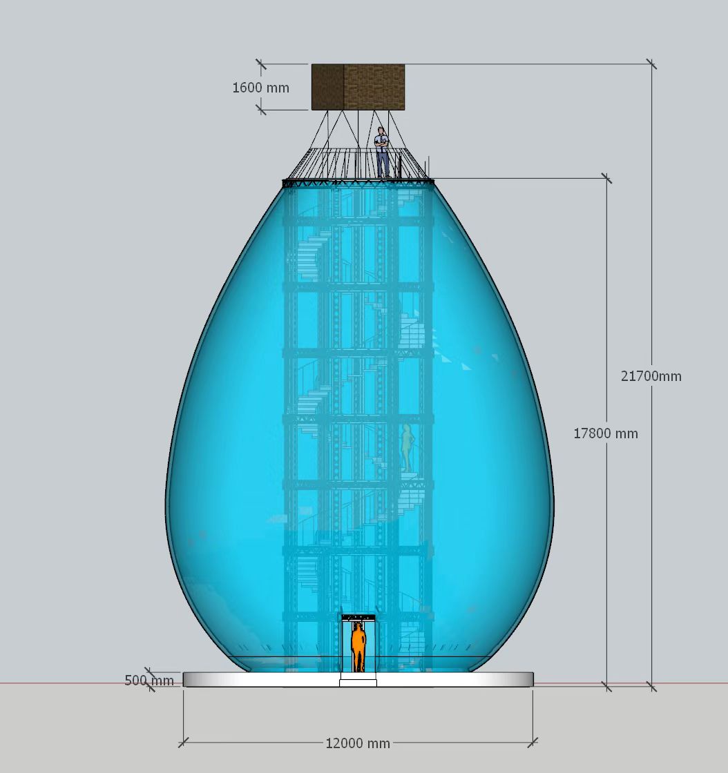 作为本次新绎国际艺术双年展中体量最大的艺术作品,其尺寸为1360x1360x2150cm。内部为金属框架,设有一条旋转楼梯,外部呈现为一个倒立的热气球。“作品邀请观众脱离地面的束缚,进入一种更轻盈的状态”,观众可以沿着旋转楼梯直上,一直走到作品的顶部。