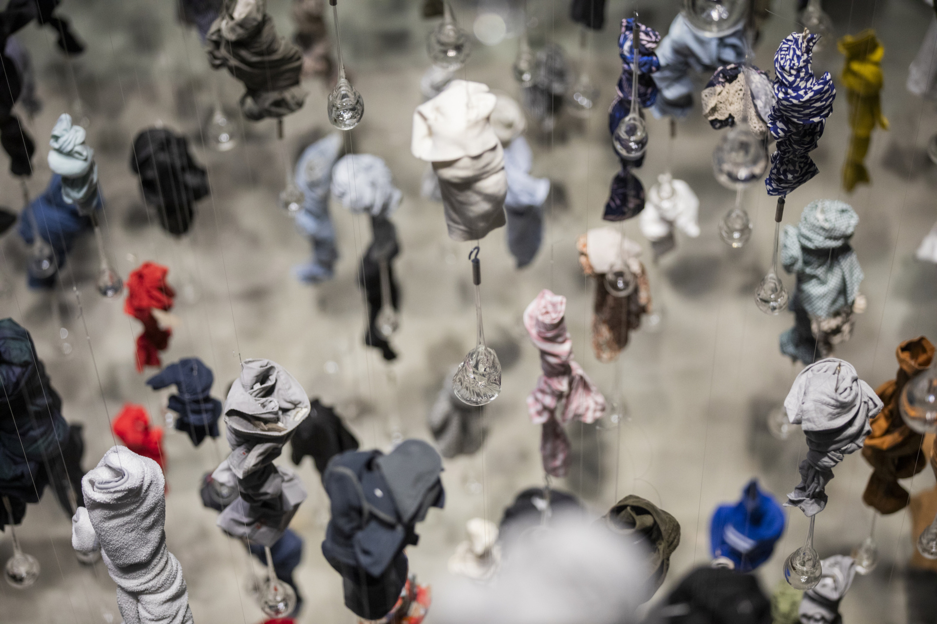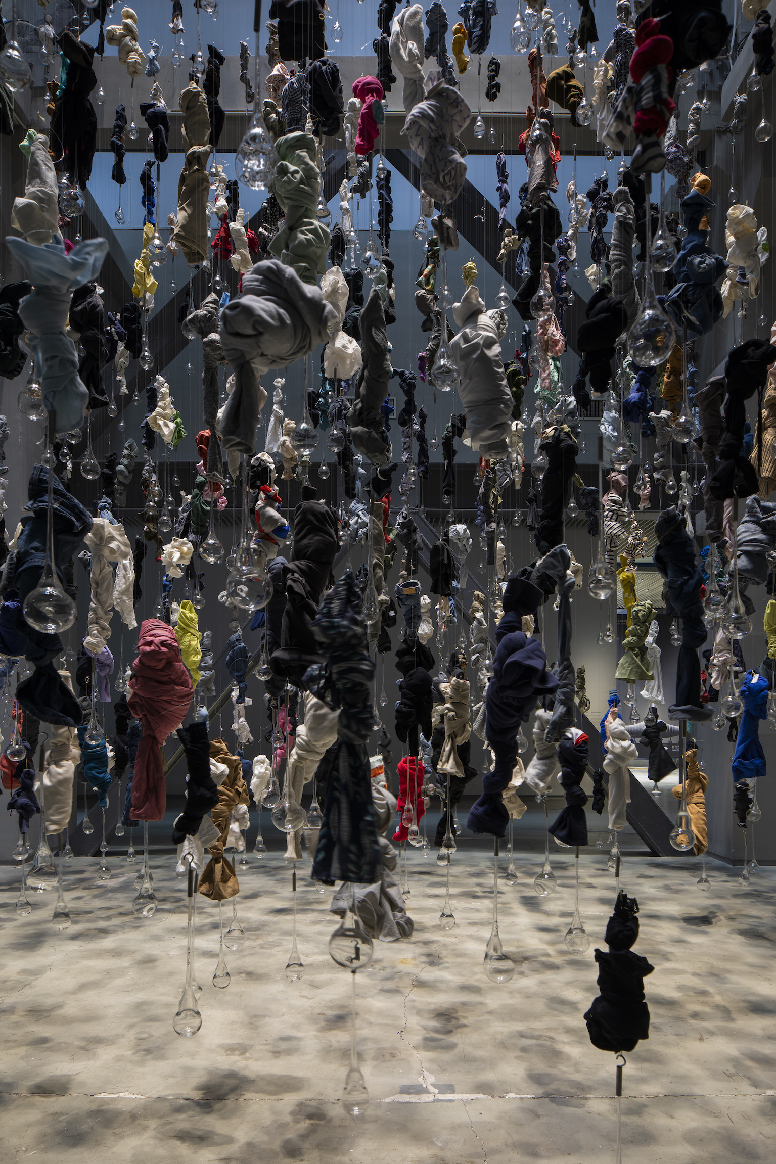 作品《1080口气在上海PSA》是由1080件的衣物与1080个人的1080口气组成,布展过程不仅需要长时间的作业,同时也要保持足够的细心与注意力。这其中的玻璃器物最薄处不足0.5mm,其易碎程度比灯泡还要高,而这样的玻璃器物有千余件,均匀分布在6米见方,14米高的空间中。