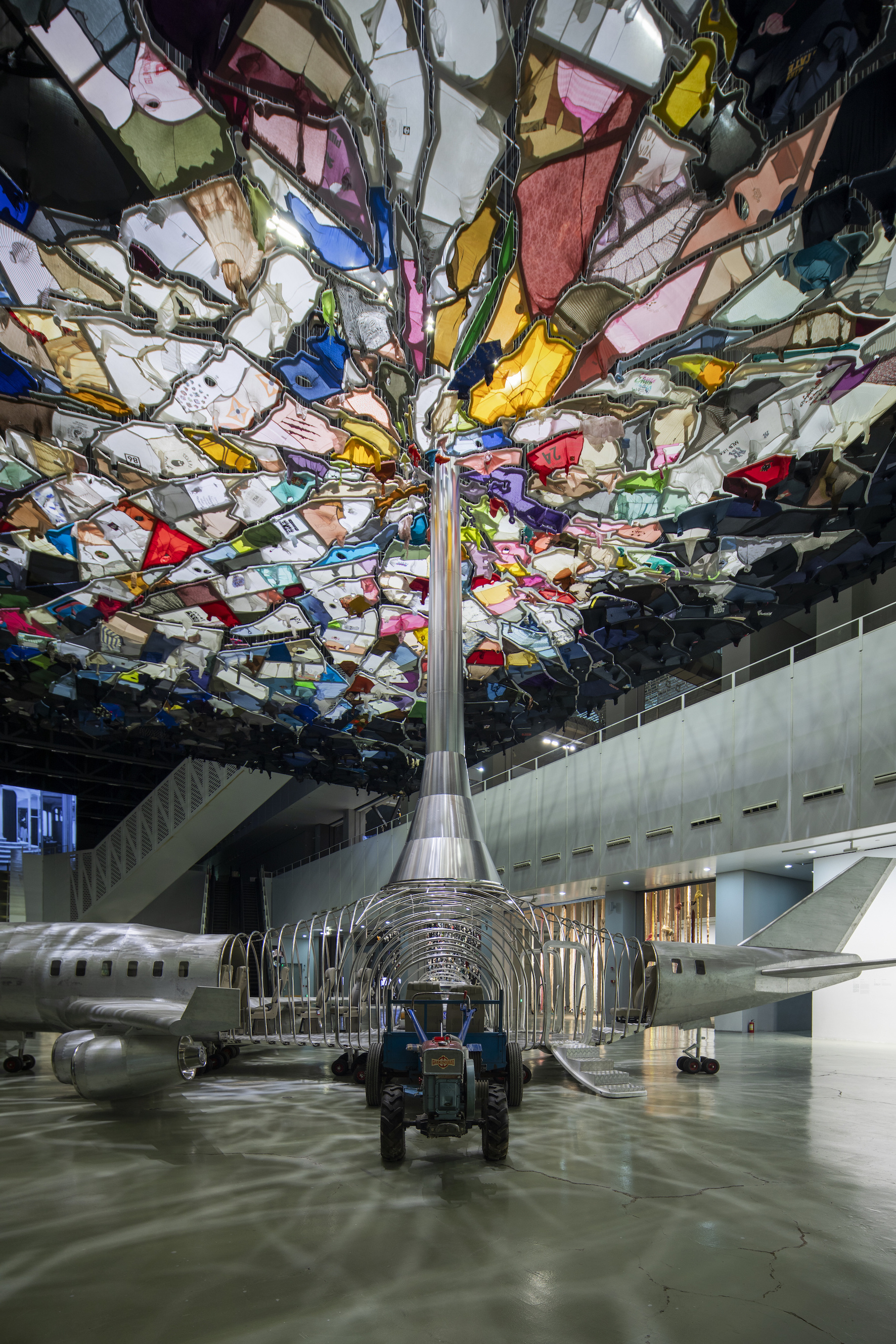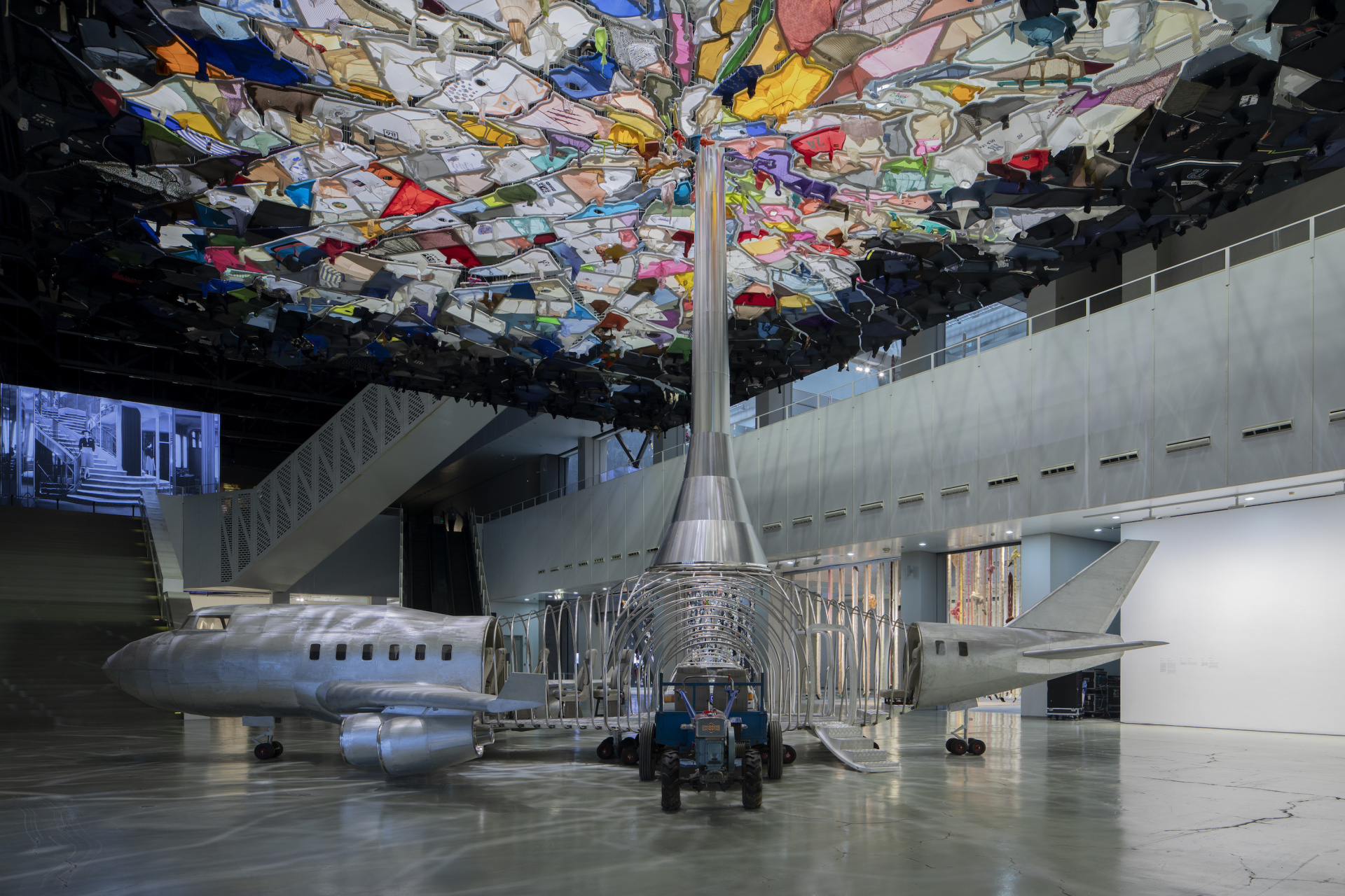 在十一月初,艺术家尹秀珍的二十件材料和语汇各异的巨作陆续进入上海当代艺术博物馆,等待最终的呈现。《飞行器》中嫁接在一起的农用手扶拖拉机、上海桑塔纳轿车以及一架用铝皮和日常用品模拟制作的波音747民航飞机;《补天》中缝为一体的上千件“天空色”旧衣服;《1080口气在上海PSA》中造型各异的玻璃器皿与艺术家收集的旧衣物等不同材料间的碰撞。空间上,无论是高悬于中庭还是散落于台阶上的艺术装置,纵向空间与梯级空间的交织。又或是艺术家将视觉、听觉、嗅觉、味觉、触觉和观想融入不同的作品。这一切无疑是将观众带入进一个多感官的盛宴之中。