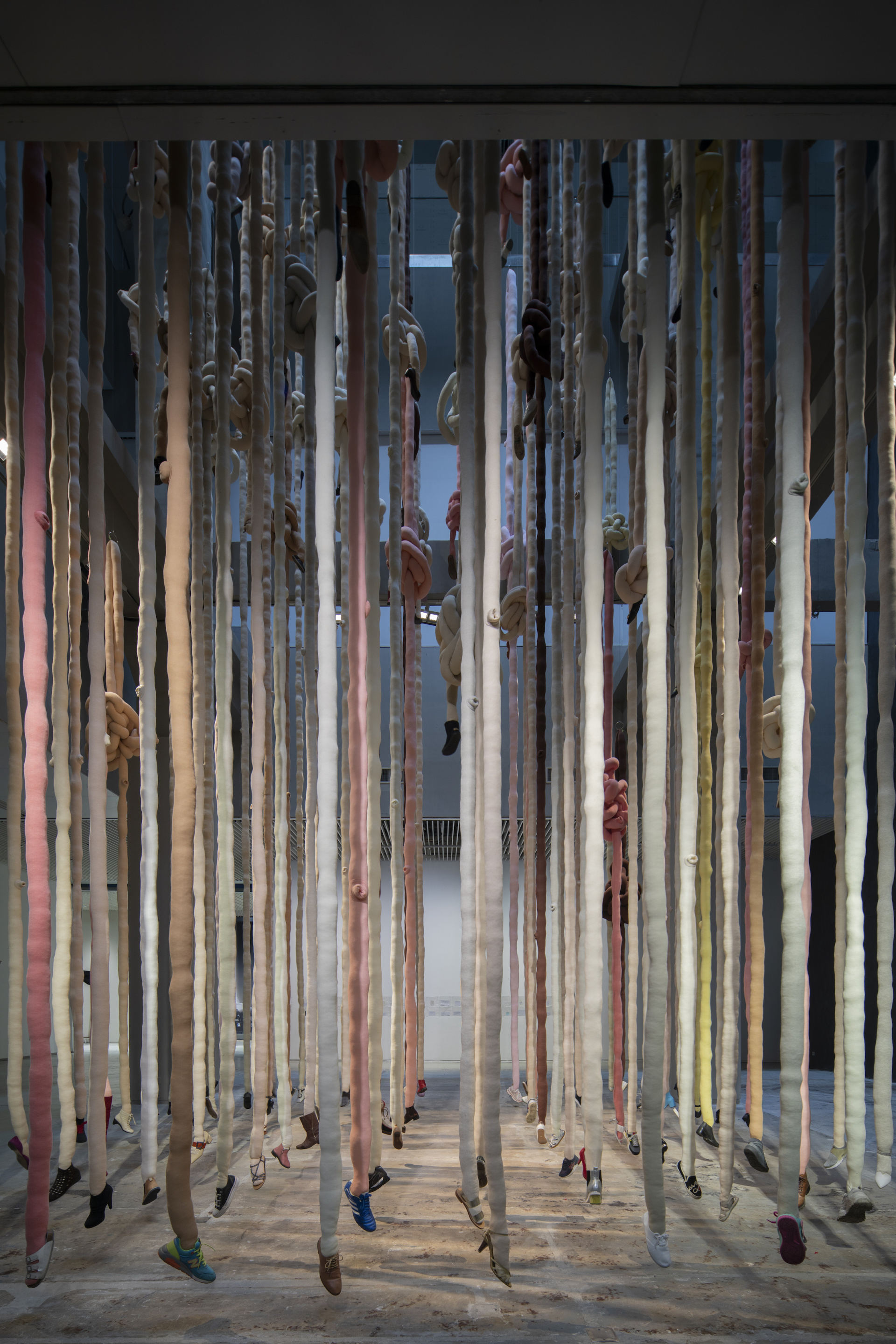 作品《补天》是由上千件衣物碎片组成,面积达到25m x 17m,累计共使用1300多根钢丝吊装。由于碎片之间并未有连接,为了最终整件作品处在同一水平面,需要对吊装钢丝进行调整,控制每一件碎片的悬挂高度。