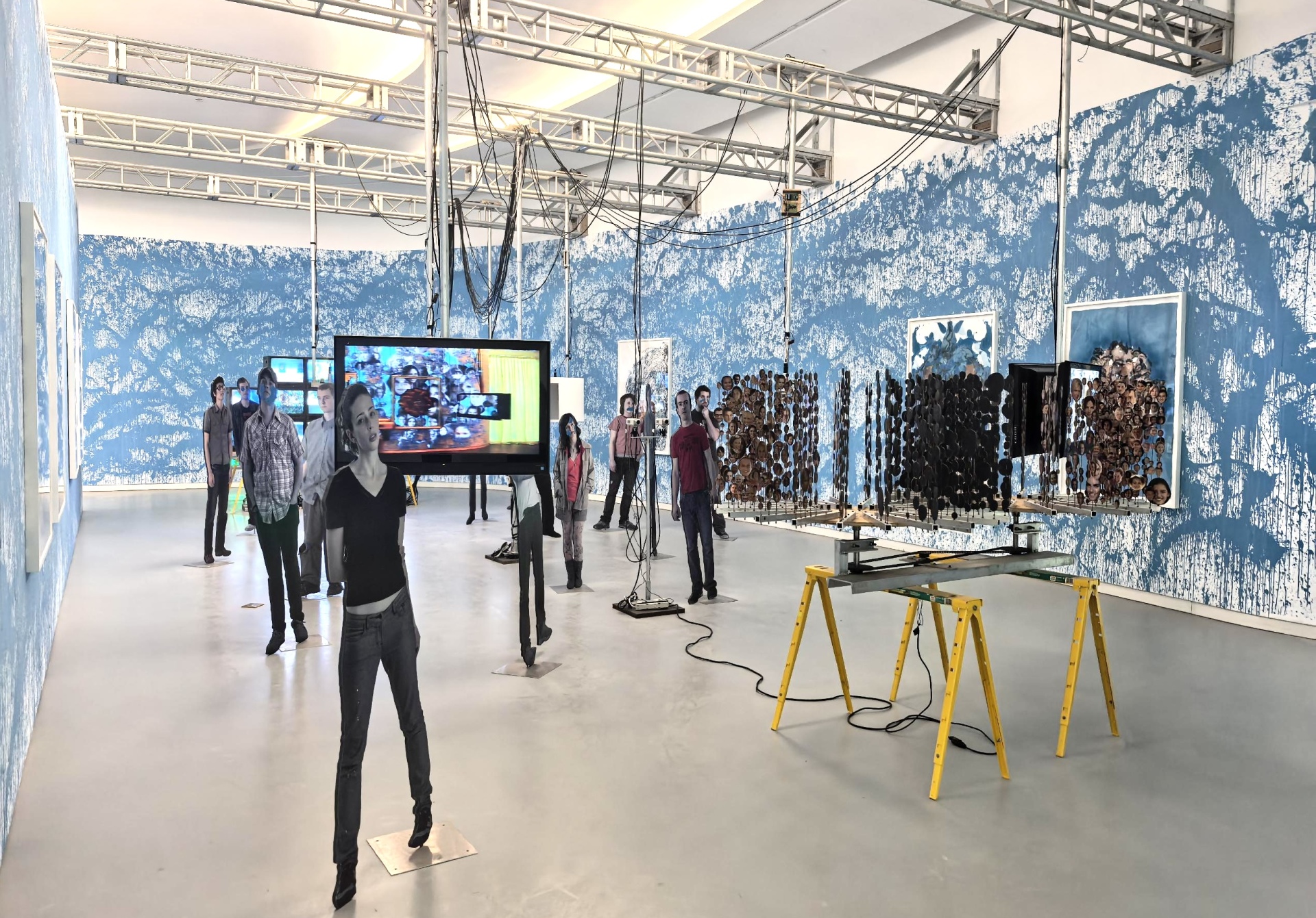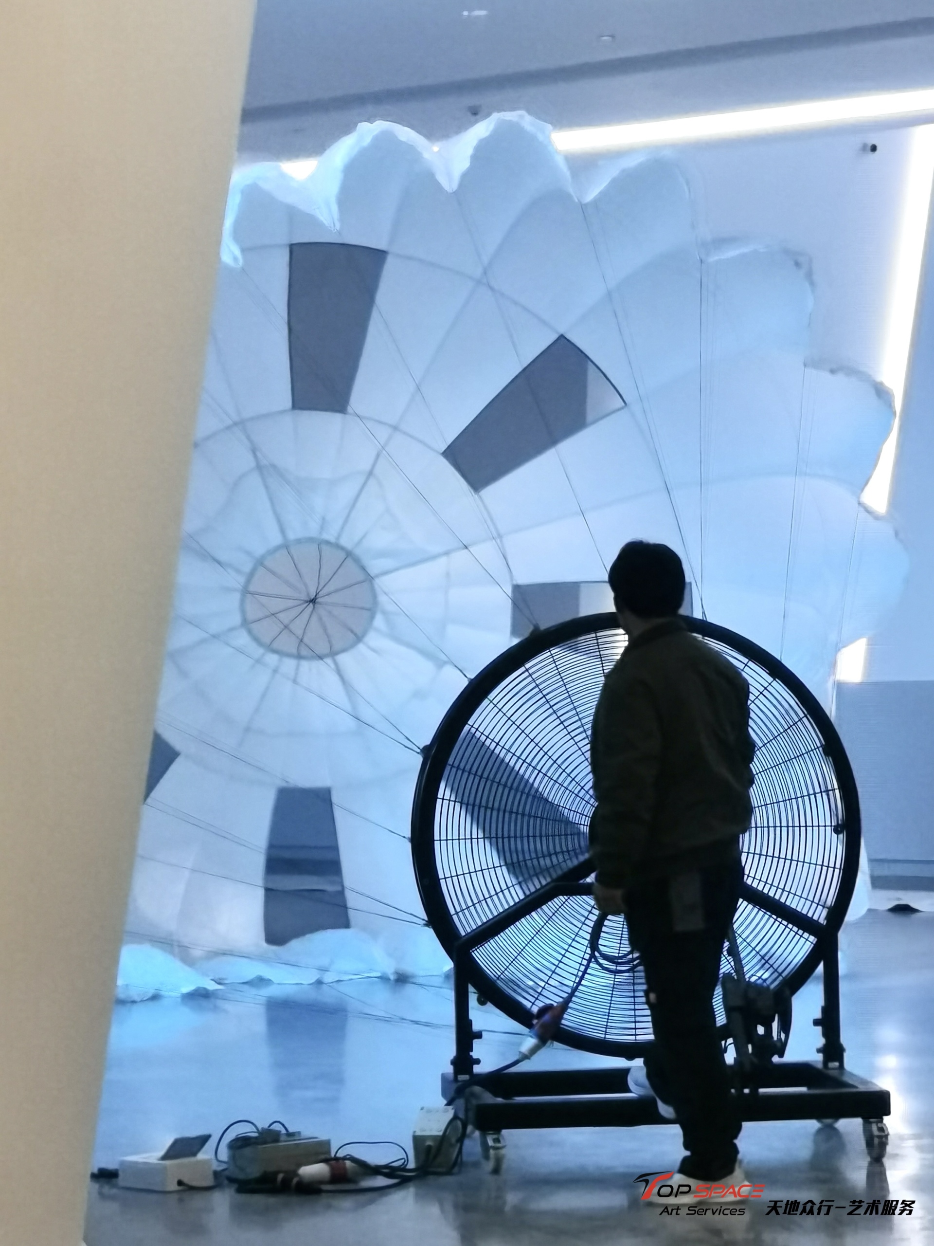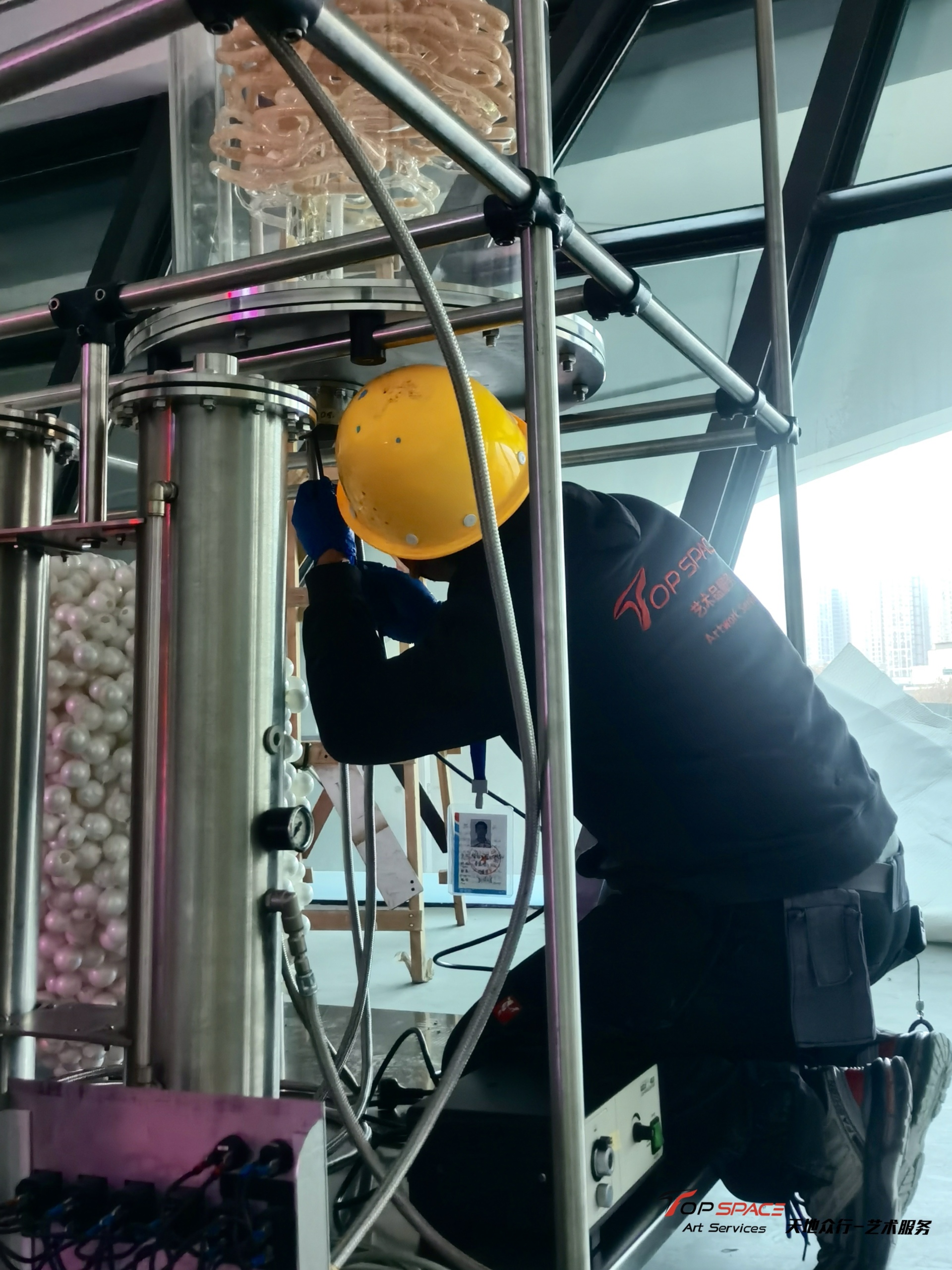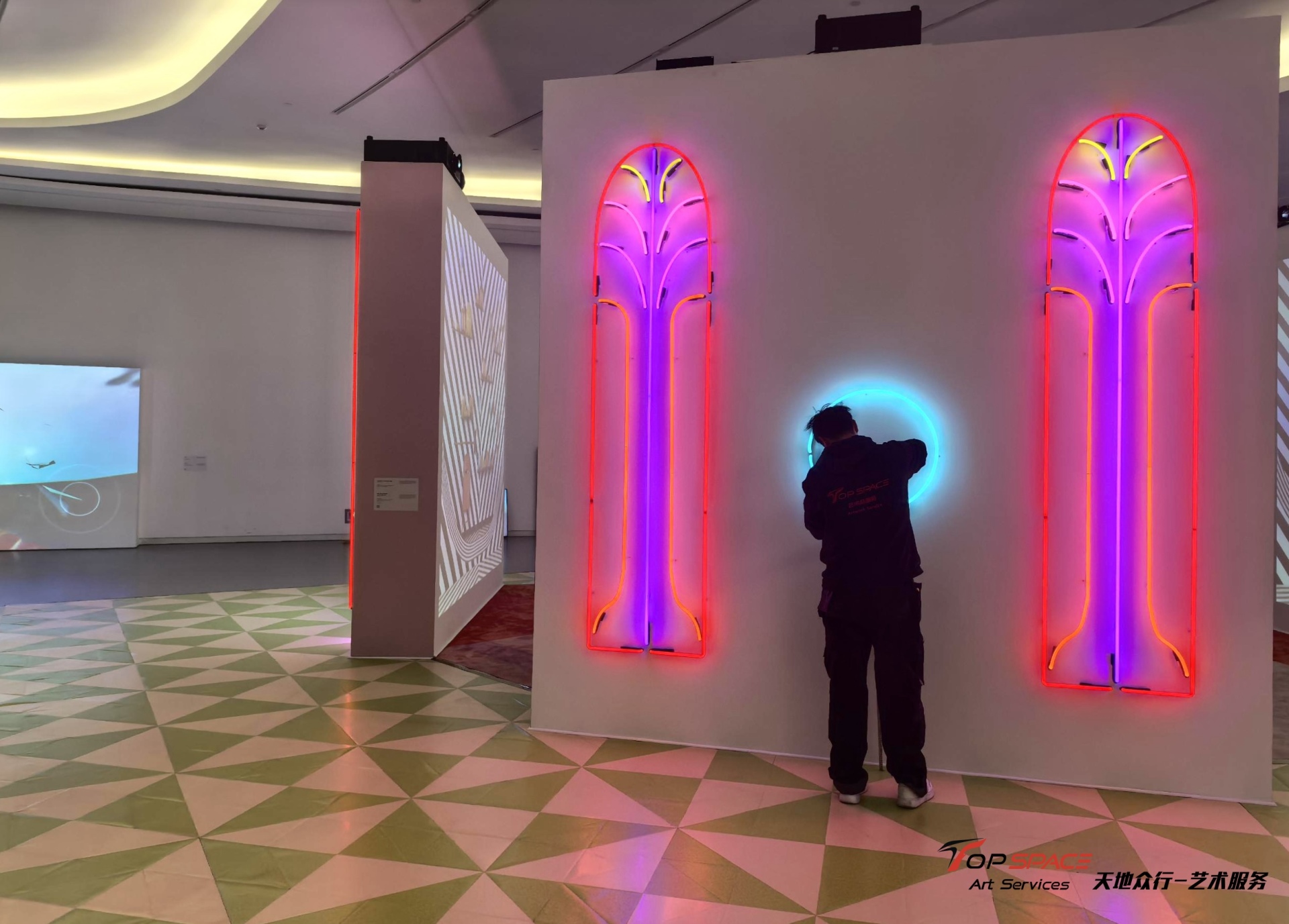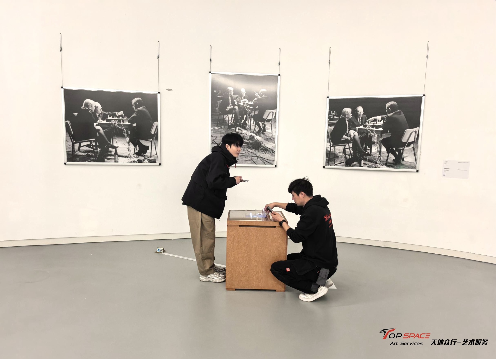 本次展览,天地众行团队负责多位国内外艺术家作品的安装。多媒体装置艺术品不同于传统的绘画、雕塑作品,在安装过程中可能存在各种变故,例如水循环、电力供应等情况都需要实地调整。本次展览中的舞台与银幕模型作品多次更换设备与方案以达到艺术家所要求的理想展出状态;展出的蓝色时代作品同样也是多次与国外艺术家连线沟通布展的细节、泼墨的方式,基于过去多年专业的布展经验,以求可以百分百达到艺术家所期许的展出状态。