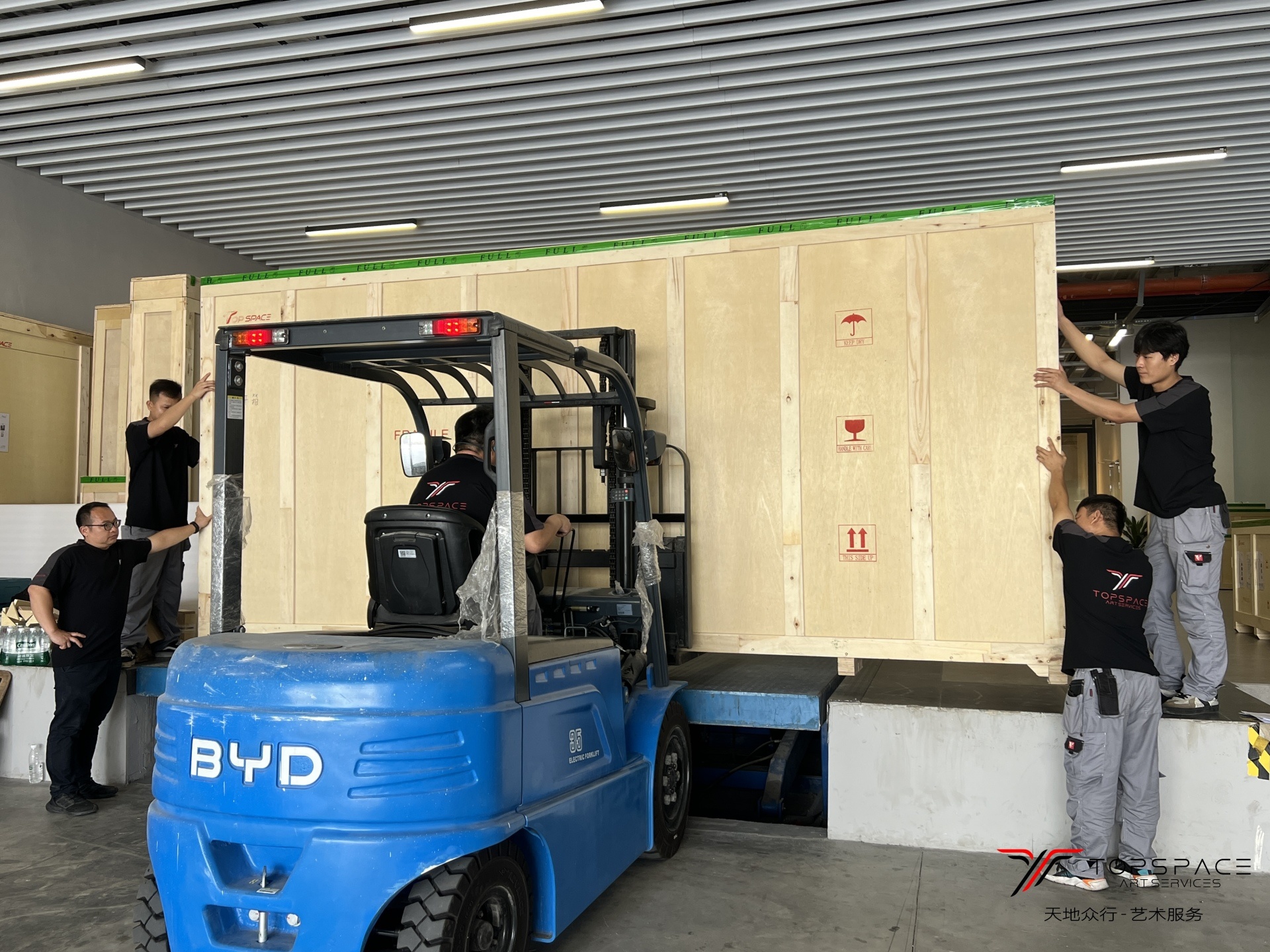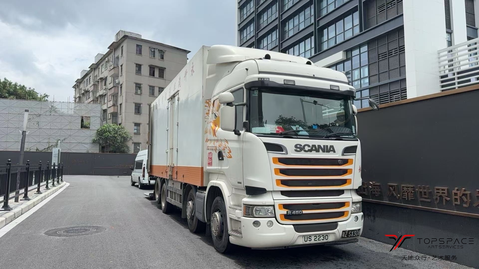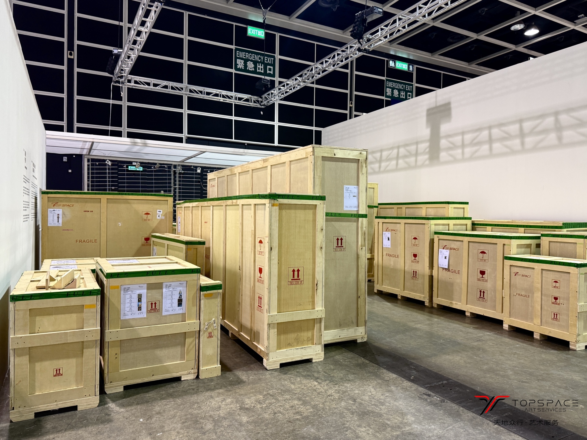 本次展览由天地众行提供全程艺术服务,内容涵盖:展出文物及艺术品的包装、文物鉴定、清关、粤港卡班专线运输以及现场服务等。由于此次文物及艺术品的尺寸较大,使用了专业超高尺寸的恒温恒湿气垫车进行运输。
