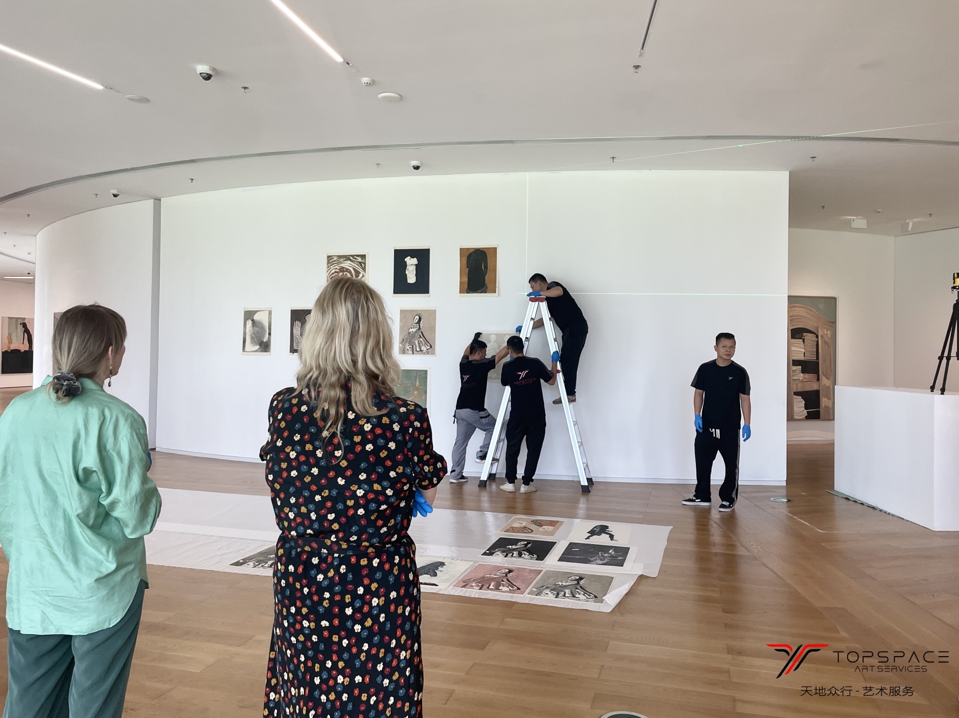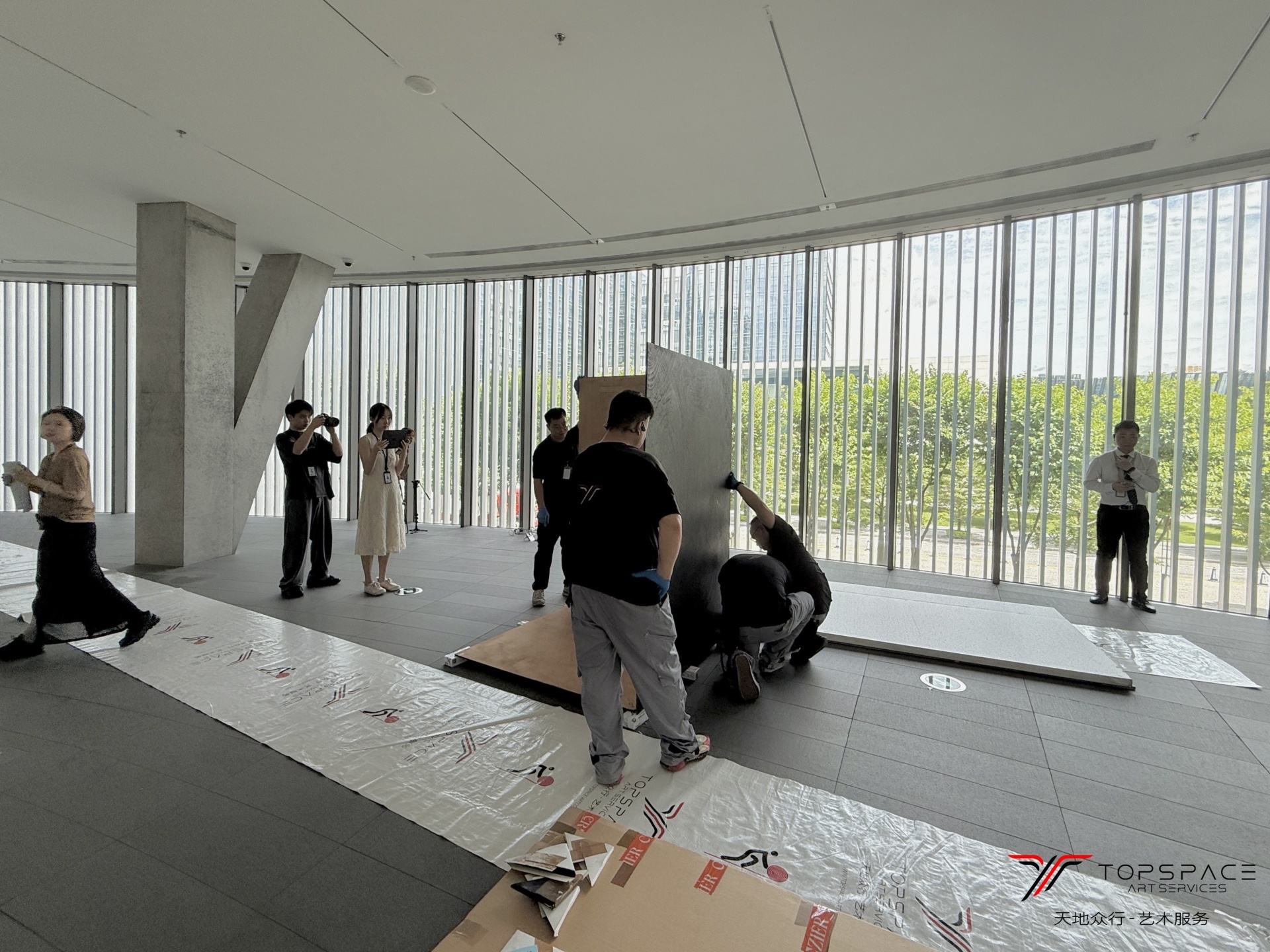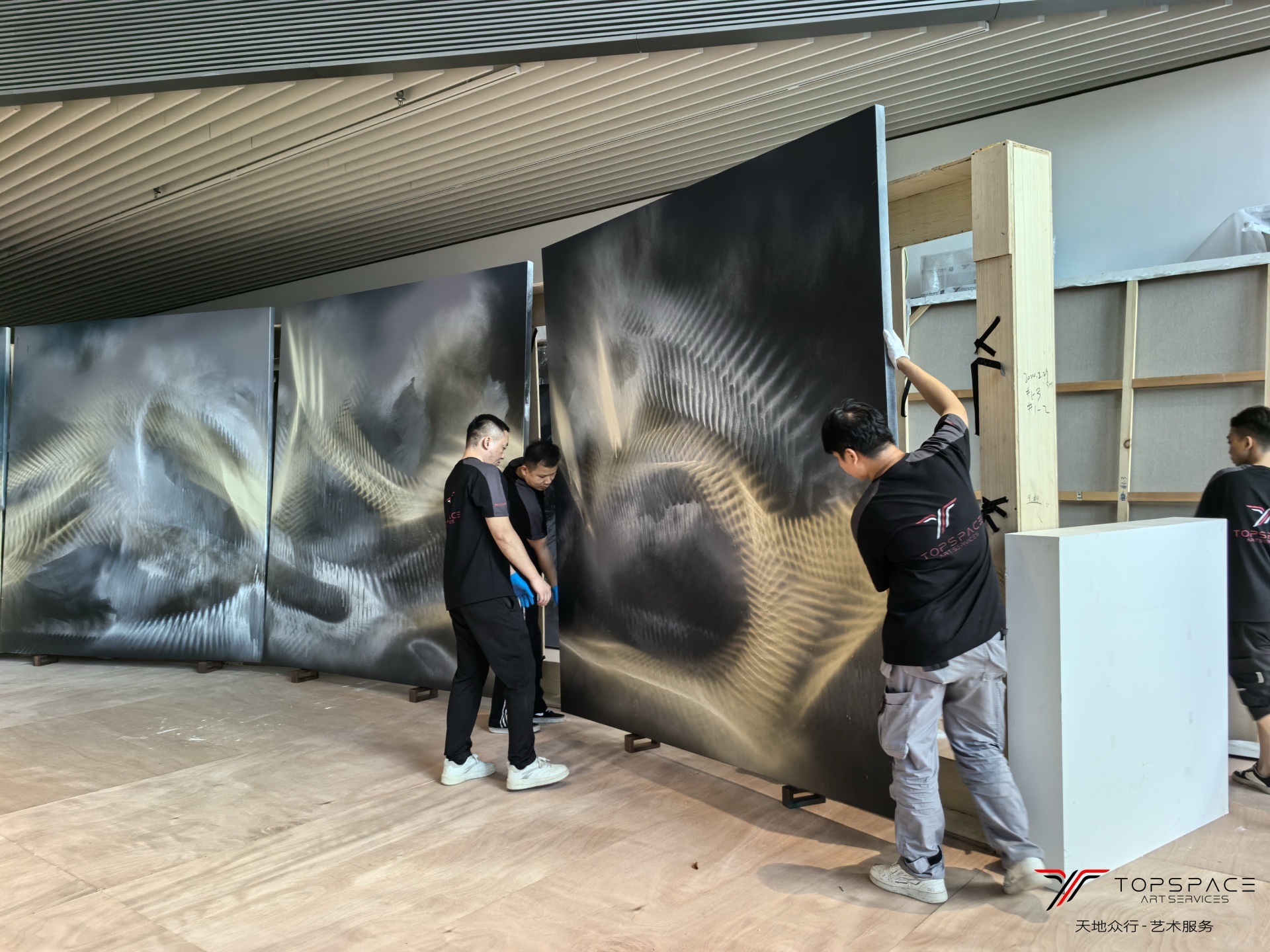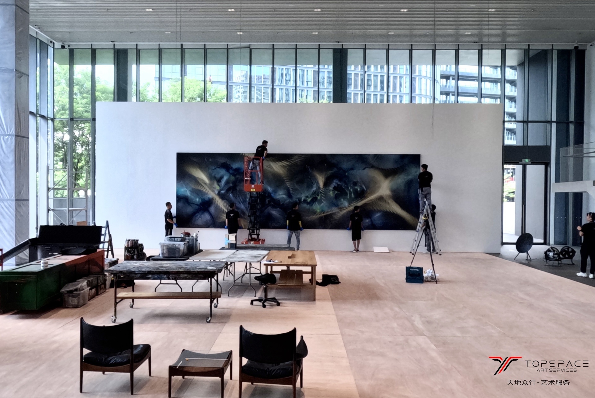本次项目由天地众行全程提供艺术服务。展出作品中包含一幅8米长的超大型绘画作品,从作品的定制包装到运输,以及最终的进场布展,每一个环节都需要前期精确地测量和规划才能保证作品最后的安全上墙。这些都是基于天地众行团队积累的丰富的艺术服务经验,只有对整个过程的足够熟悉,并且在前期做好充足的筹备,才能确保艺术服务的顺利实施。