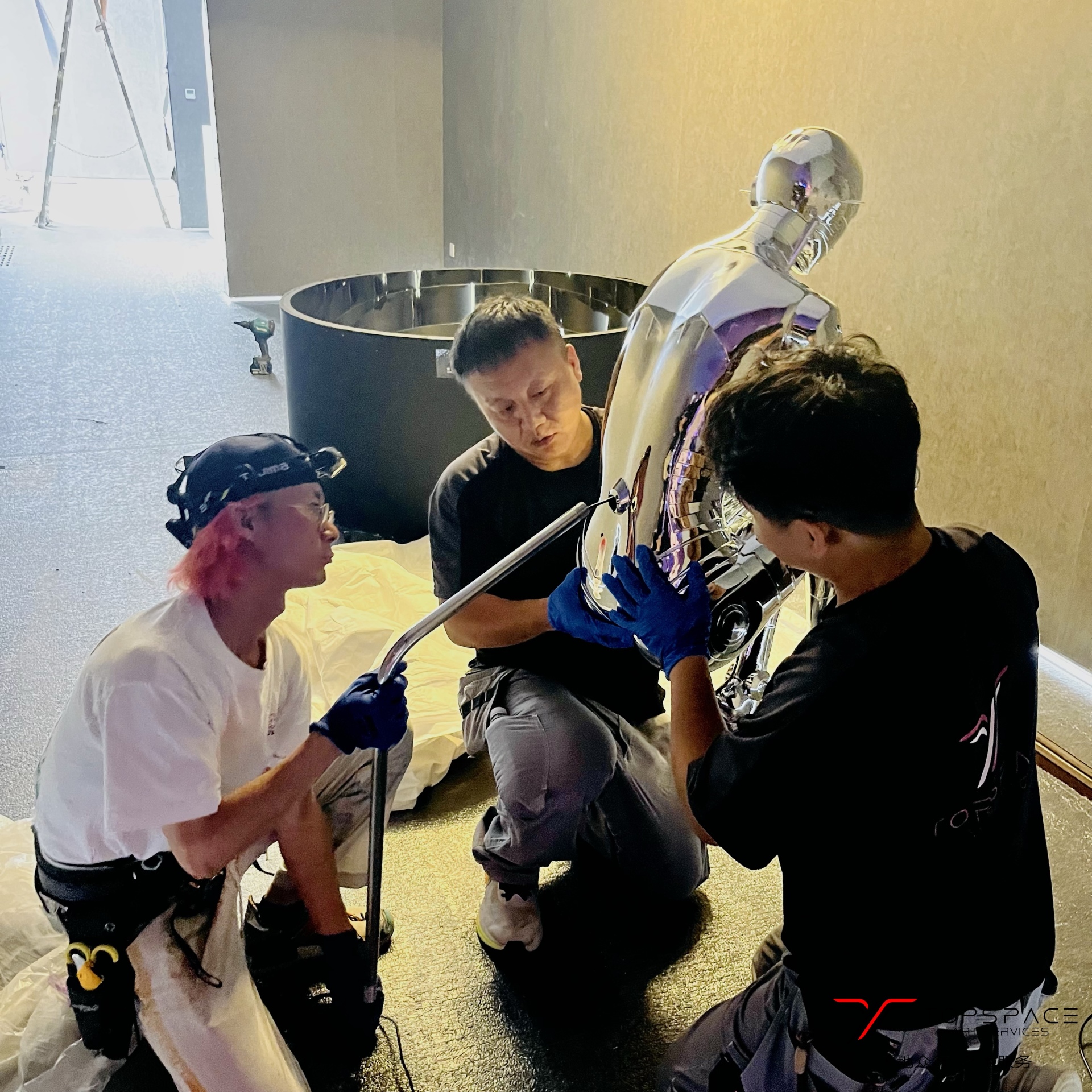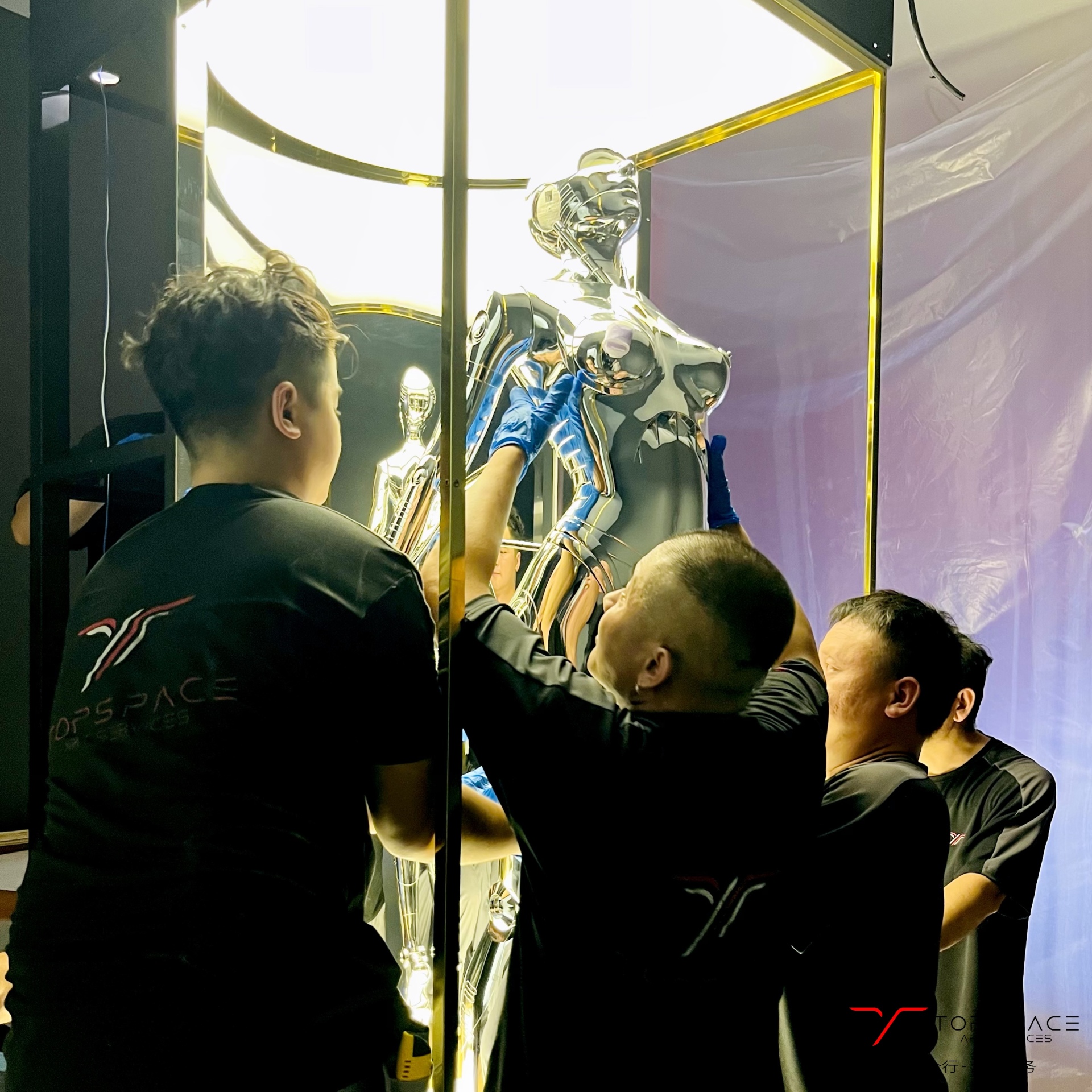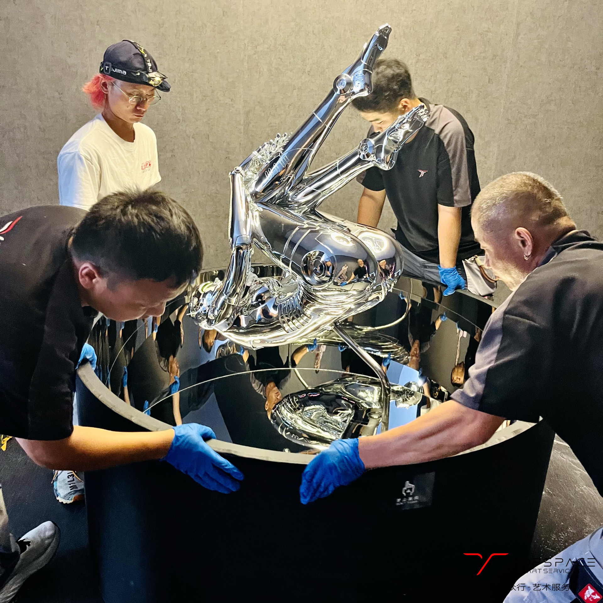 此次展出艺术品中以空山基知名系列《SEXY ROBOT》机械姬最具代表性,为了保障作品的完美呈现,天地众行团队在作品的包装与布展过程中,仔细严谨,注意每一处细微的动作,尽可能把控周围环境的无尘程度,确保艺术品表面极致的镜面效果。
